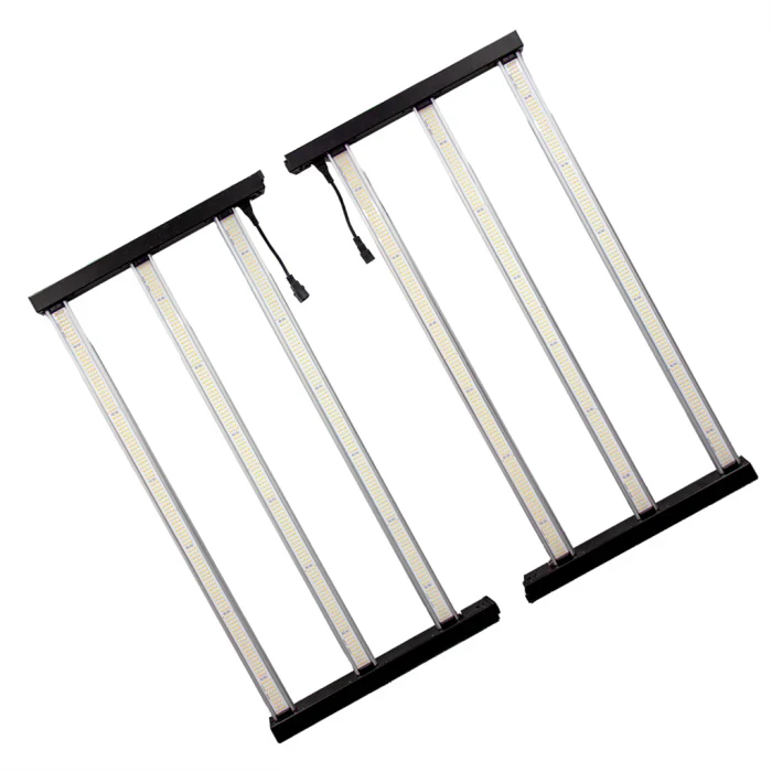 The LED grow light fixture features an impressive operating efficacy of 2.9 µmol/J, with LED chips achieving 3.4 to 3.7 µmol/J. It delivers a maximum PPF of 2596 µmol/s at 960W, split between two 480W ballasts, outperforming typical 1000W HPS lamps. Lightweight and easy to install, this versatile fixture consists of two interlocking halves, each with its own power socket. It can be configured as a single 6-bar fixture for 1.5m x 1.5m coverage or two 3-bar fixtures for up to 25% larger areas. The halves can be powered by one or two Maxibright 600W Electronic Ballasts, with two ballasts increasing light output by at least 25%.